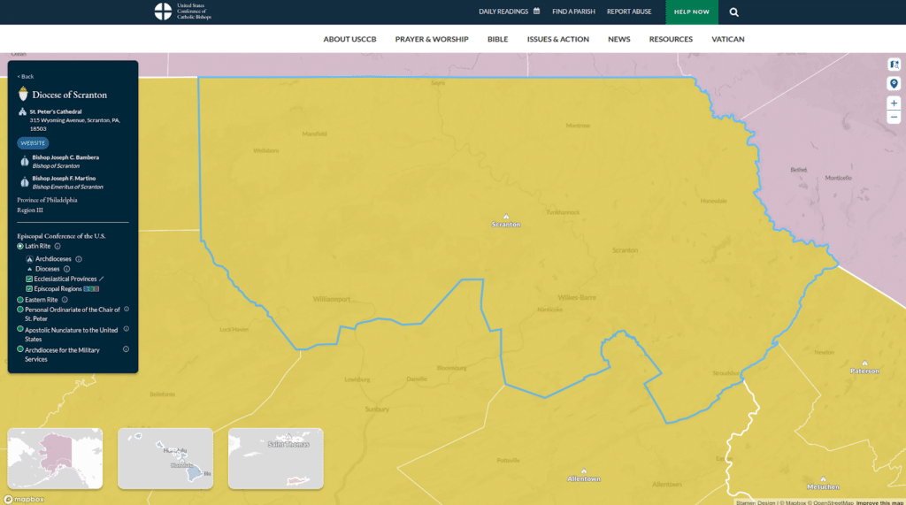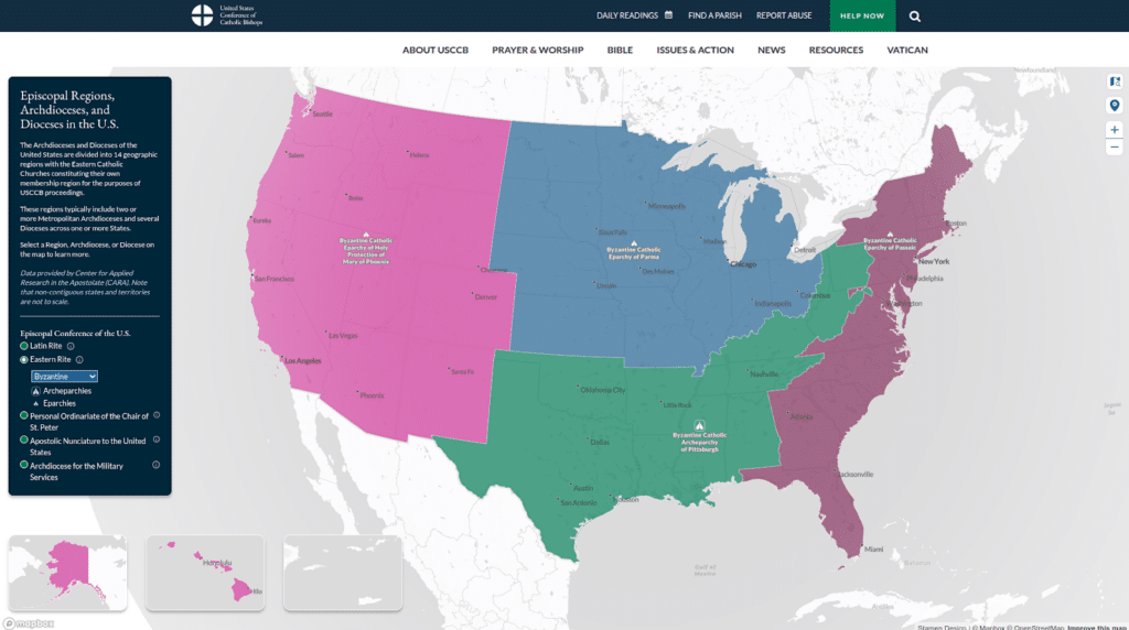 In order to show all regions covered within USCCB’s jurisdiction at once, we have included three inset maps for noncontiguous areas: Alaska, Hawaii, and the US Virgin Islands. Selecting a diocese within one of those areas flies the main map to that location for easier viewing.