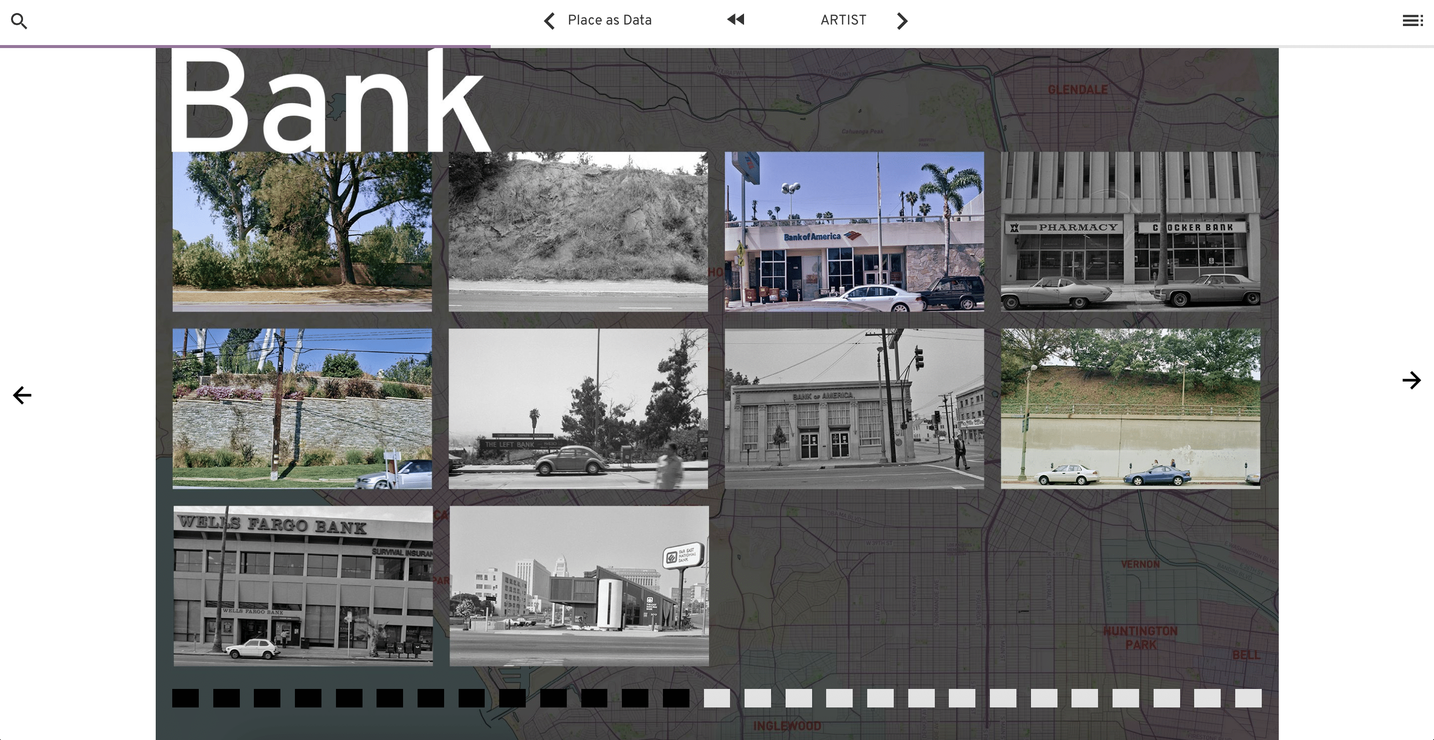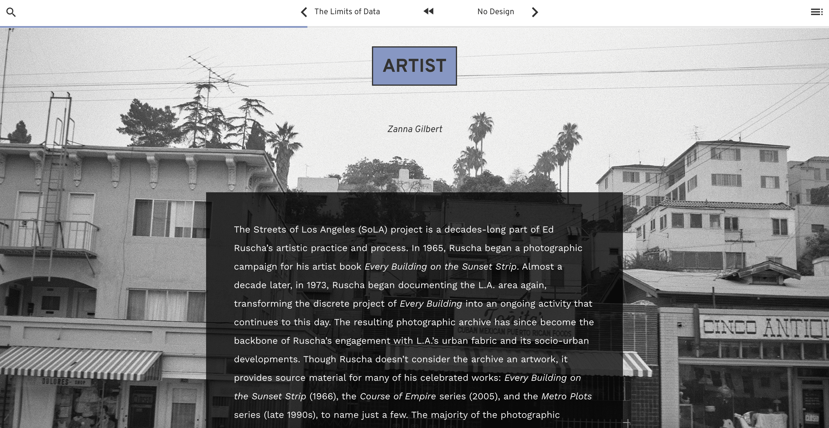 In the final piece of this collaboration, we developed 3 distinct “flipbook” experiences that would allow readers to contextualize the Getty archive geographically, learn more about the geotagging of the archived photographs, and discover stories that would have been impossible without computer vision tagging of the imagery. Ed Ruscha’s Streets of Los Angeles is available in paperback here.