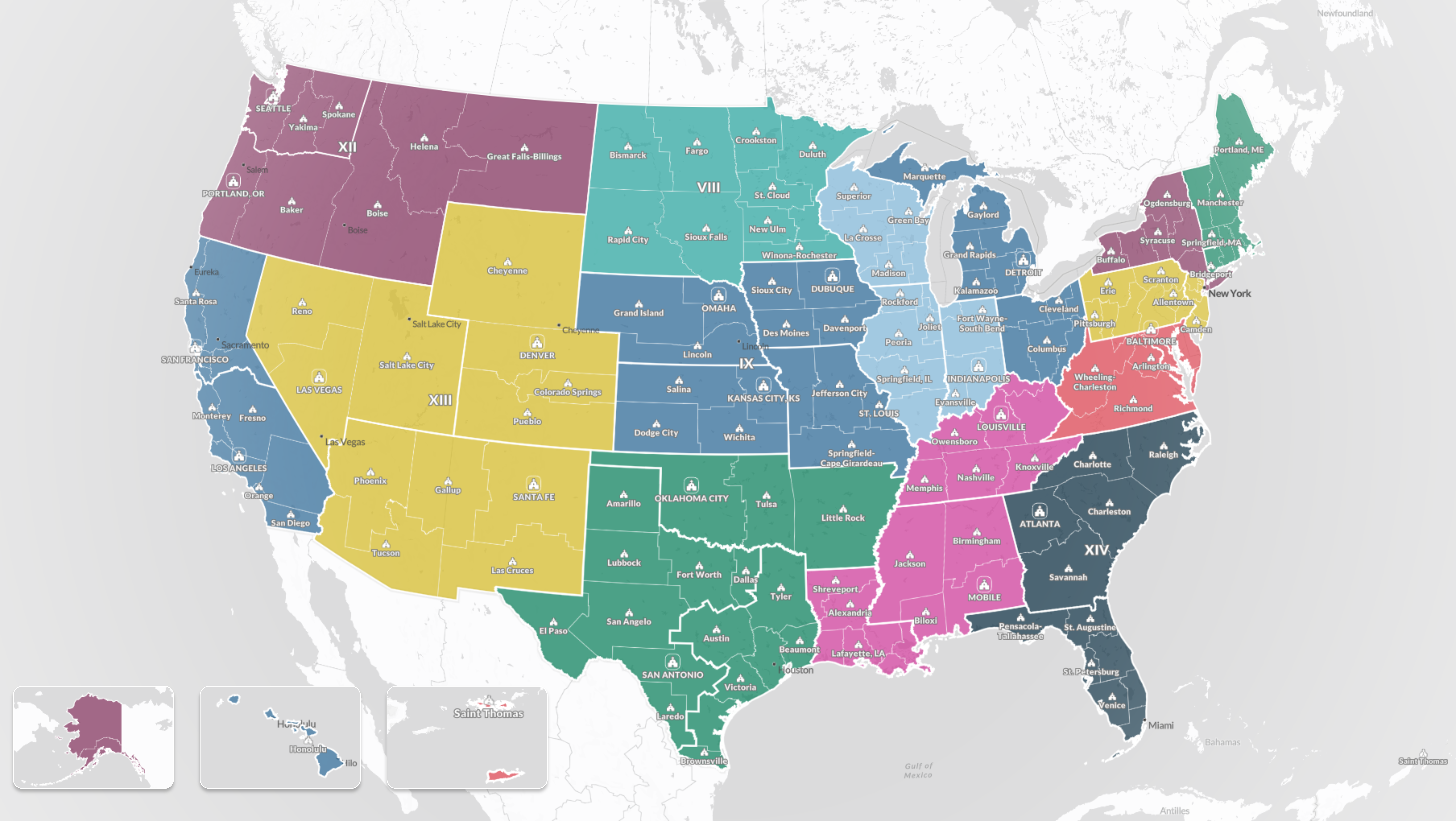 The national map we created includes detailed information about bishops, episcopal regions, dioceses, eparchies, and more for all USCCB members. As part of this effort, we mapped Eastern Rite eparchies and archeparchies for the first time. Design-wise, the Episcopal and Diocesan Map uses meaningful elements of Catholicism in its color palette, iconography, and general terminology.
