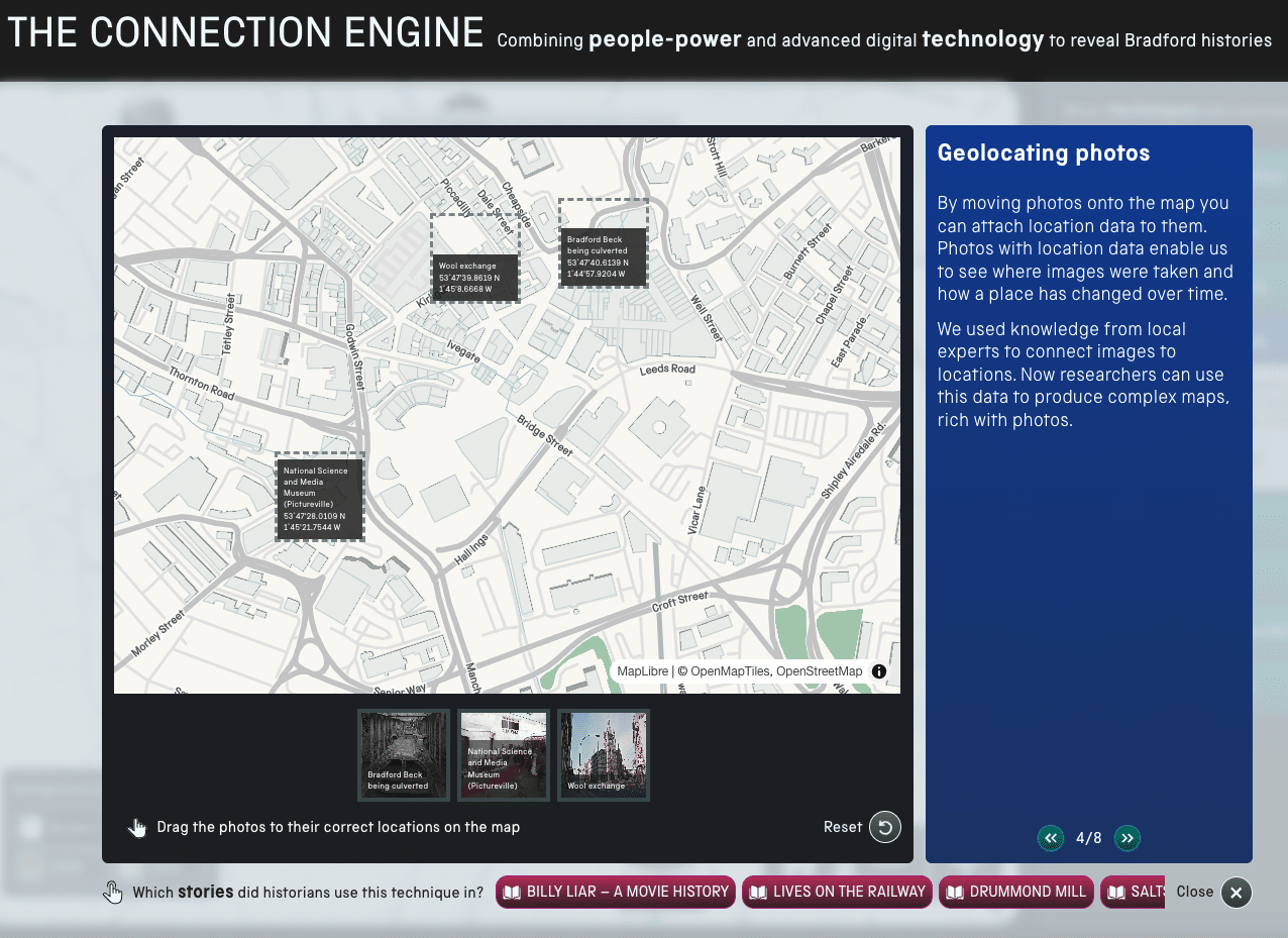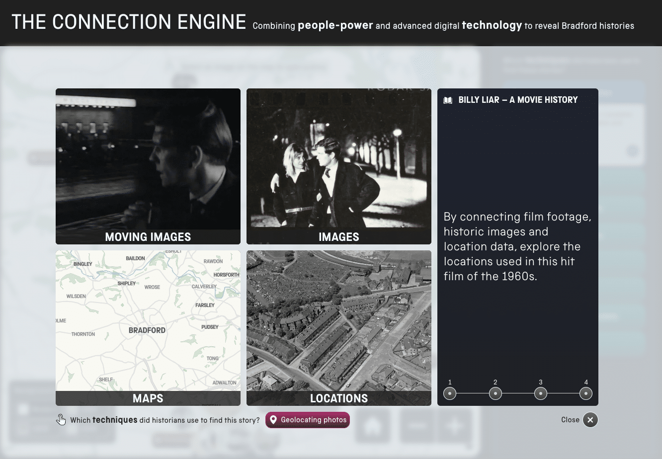 We worked on a tight timeline to iterate, build, and test an exhibit for a large interactive touchscreen and immersive wall video display. The exhibit allows users to explore and filter data stories on a map of Bradford by technique where they can open a story and step through the data themselves. Visitors can also dive deeper into each technique by playing an interactive game to give them a sense of how historians use it in their research.