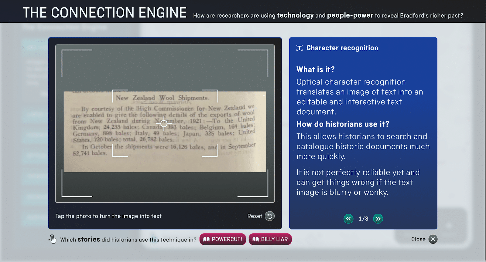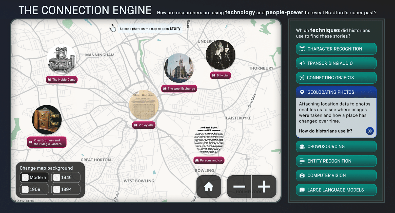 The Science Museum in London needed help creating an exhibit for their museum in Bradford, England to showcase how historians are using advanced digital technologies to bring historical Bradford to life. By using techniques like large language models, transcribing audios, etc. researchers were able to collect a diverse set of data, bringing new perspectives to the places, people, and things that make up Bradford’s history. They needed an exhibit to showcase just this and be approachable and interesting for your average visitor.